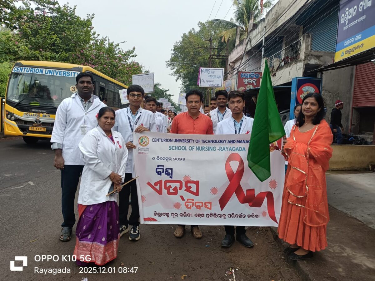 ସେଞ୍ଚୁରିଆନ ୟୁନିଭର୍ସିଟି ଅଫ ଟେକ୍ନୋଲୋଜି ଏବଂ ମ୍ୟାନେଜମେଣ୍ଟ, ରାୟଗଡାବିଶ୍ୱ ଏଡସ୍ ଦିବସ ୨୦୨୫: ସଚେତନତା ରାଲି – ନର୍ସିଙ୍ଗ ବିଭାଗର ଉଦ୍ୟମ