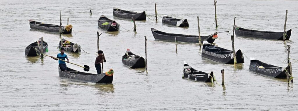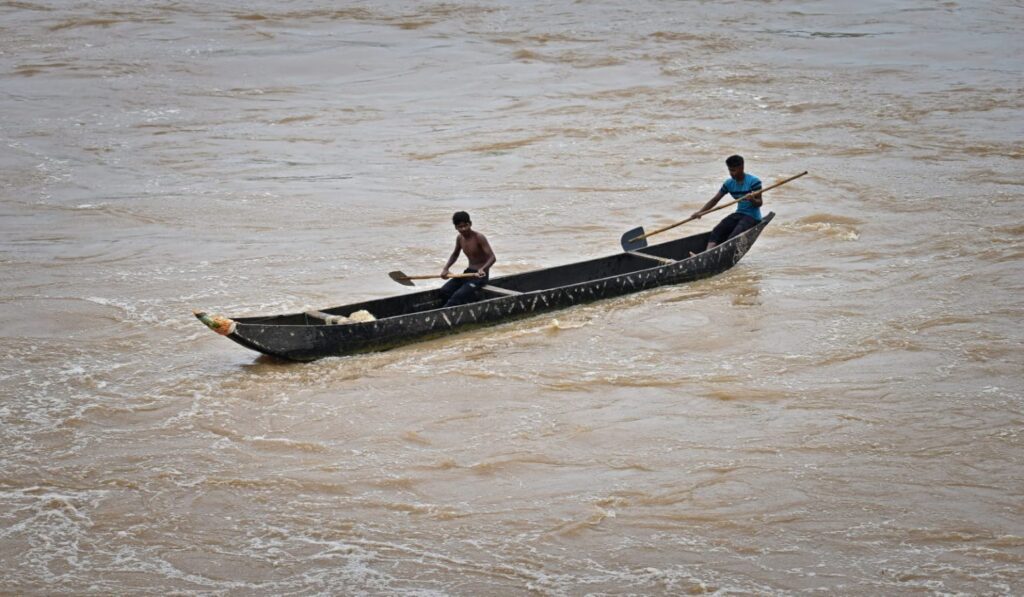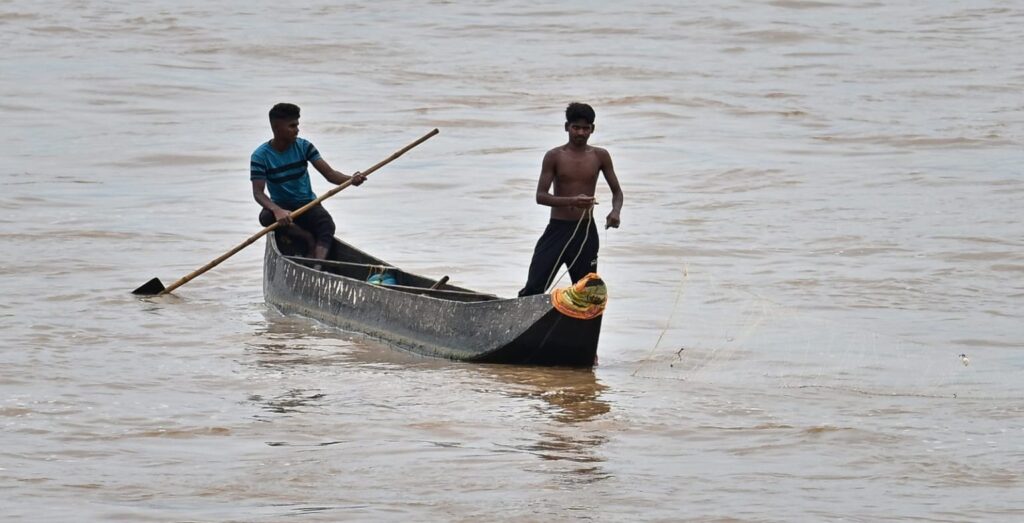 ନରାଜ ଆନିକଟ ଠାରେ ପ୍ରବାହିତ ବନ୍ୟା ଜଳରେ ମାଛ ଧରୁଥିବା ଧିବର